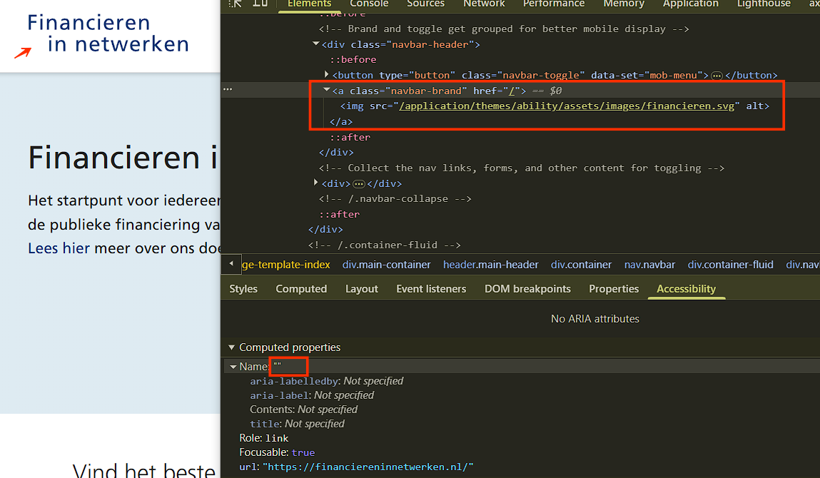 De link bestaat uitsluitend uit een afbeelding (logo) zonder tekstalternatief. Daardoor heeft de link geen inhoud voor hulpsoftware zoals schermlezers. Ook is niet duidelijk naar welke bestemming de link verwijst (2.4.4). De link heeft daardoor geen toegankelijke naam en voldoet niet aan succescriterium 4.1.2. De zichtbare tekst in het logo staat niet in de toegankelijke naam van de link. Daardoor werkt de link niet goed als deze met een stemgestuurd systeem wordt geactiveerd. Daarvoor spreekt de bezoeker de tekst uit die zichtbaar is in het logo. Als de toegankelijke naam anders is, zal het systeem de link niet herkennen (2.5.3).