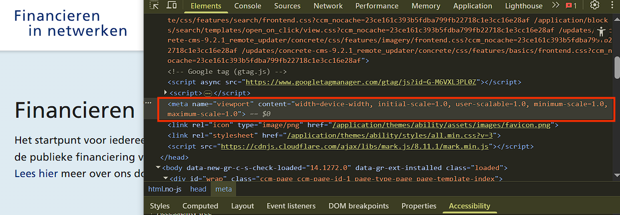 Op alle pagina’s is het attribuut maximum-scale=1 aanwezig in het <head>-element van de HTML-code.