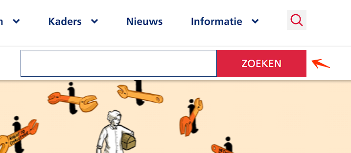In de header staat een knop met een vergrootglas-icoon die een paneel met het zoekveld opent. Dit zoekveld heeft geen toegankelijke naam.