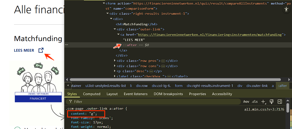 Als visueel duidelijk is waar de link bij hoort, kan deze aanvullende tekst visueel worden verborgen. Bijvoorbeeld: ‘lees meer (Matchfunding)’ of ‘lees meer (Netwerksubsidie)’.