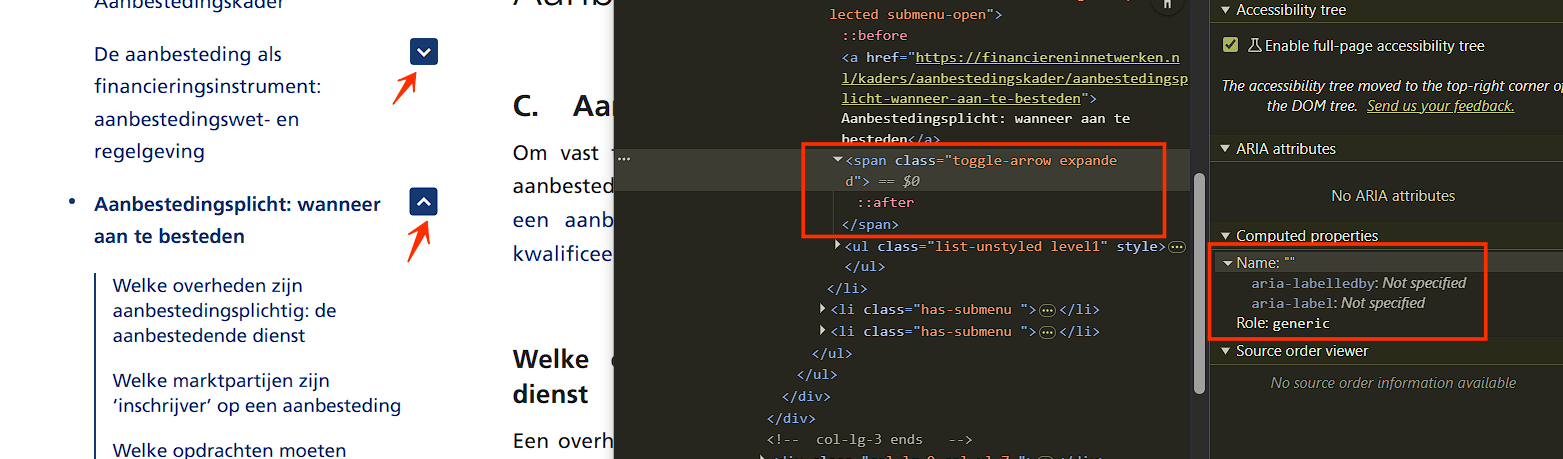 In de zijbalk staan naast de links knoppen met pijl-icoontjes waarmee je het submenu kunt openen en sluiten. Deze knoppen hebben geen juiste toegankelijke rol, naam en toestand (open/gesloten).