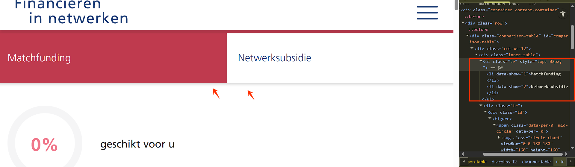 Op deze pagina staat een vergelijking tussen “Matchfunding” en “Netwerksubsidie”. De pagina is visueel opgedeeld in twee delen: één voor “Matchfunding” en één voor “Netwerksubsidie”. Deze relatie is echter niet vastgelegd in de code. Hierdoor kunnen bezoekers die een screenreader gebruiken niet begrijpen wat bij welk onderdeel hoort. De visuele structuur moet worden vastgelegd in de HTML-code.