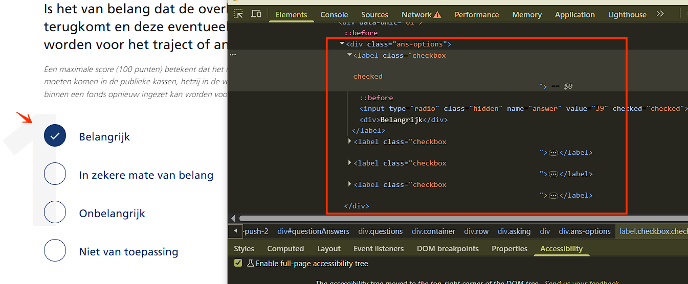 Op deze pagina staat bij elke stap een groep radioknoppen met daarboven een tekst, bijvoorbeeld: "Is het van belang dat de overheidsbijdrage (gedeeltelijk) terugkomt en deze eventueel (opnieuw) ingezet kan worden voor het traject of andere publieke doelen?" Hoewel deze elementen visueel gegroepeerd zijn, is deze relatie niet vastgelegd in de HTML-code.