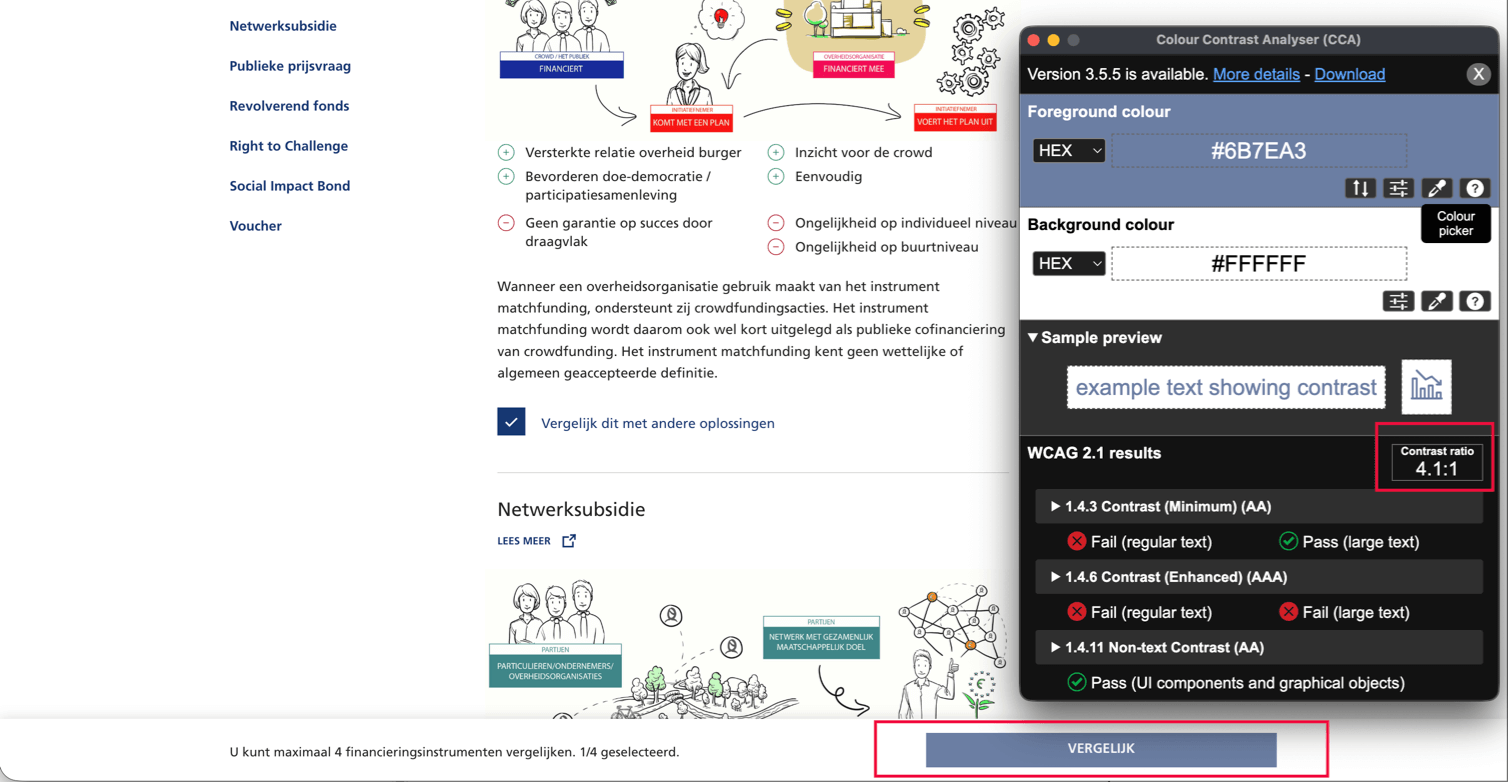 Op deze pagina wordt, wanneer een bezoeker een checkbox “Vergelijk dit met andere oplossingen” aanvinkt, de link met de witte tekst “VERGELIJK” getoond. De witte tekst staat op een grijze achtergrond (#6B7EA3). De contrastratio is te laag: 4,1:1.