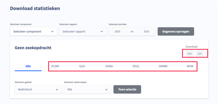 Wanneer de filters niet zijn toegepast, staan onder “Download” grijze (#A3ABBC) teksten “PDF” en “CSV”. Op de lichtgrijze (#F1F3F6) achtergrond is de contrastratio te laag: 2,1:1.