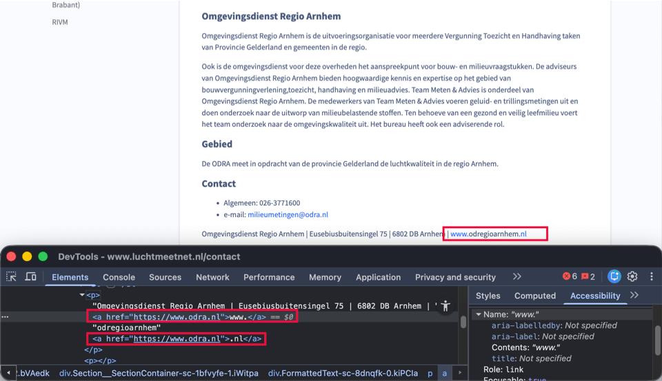 In de content die opent bij het activeren van “ODRA (Regio Arnhem)” in het zijmenu, staat onder de kop “Contact” het webadres “www.odregioarnhem.nl”. Dit webadres is opgesplitst in twee aparte links: “www.” en “.nl”. De tekst “odregioarnhem” maakt geen deel uit van de link.