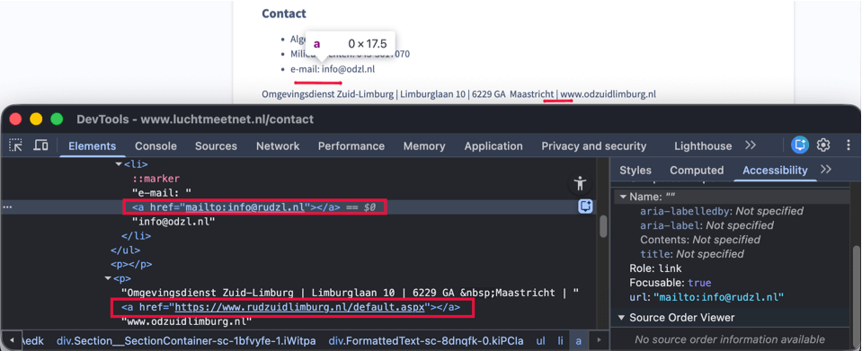 Op deze pagina staan in de content die opent bij het activeren van “ODZL (Limburg)” in het zijmenu twee niet-zichtbare links onder de kop “Contact”. Deze links zijn wel beschikbaar voor schermlezers, maar hebben geen toegankelijke naam.