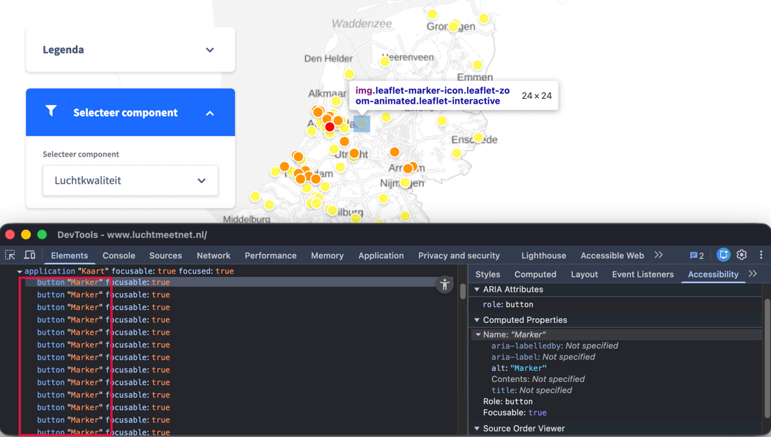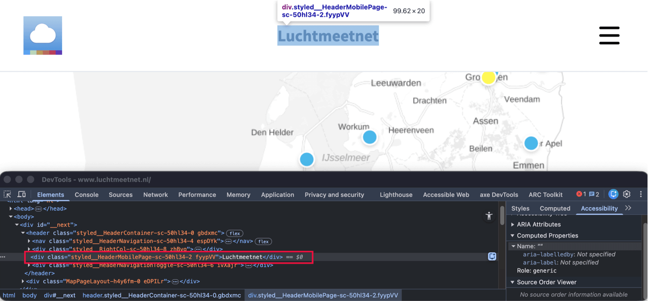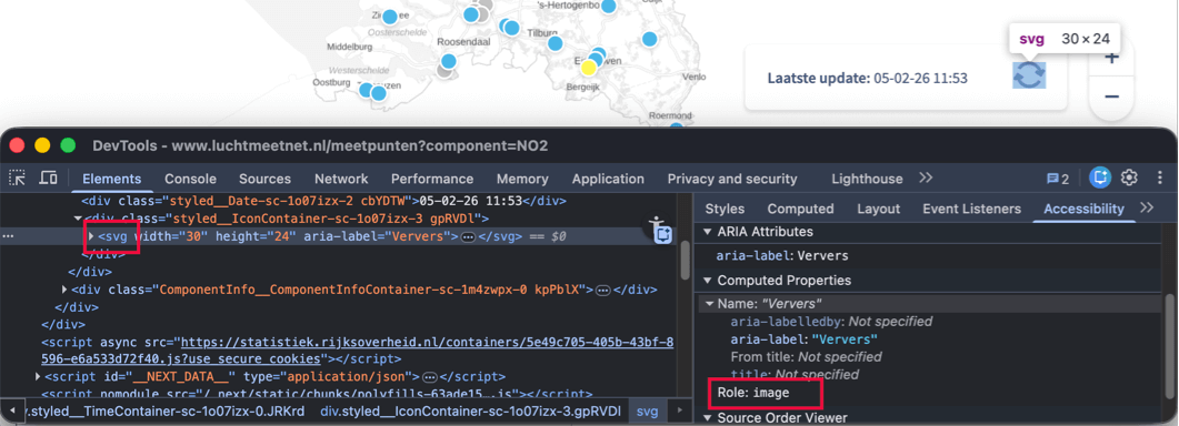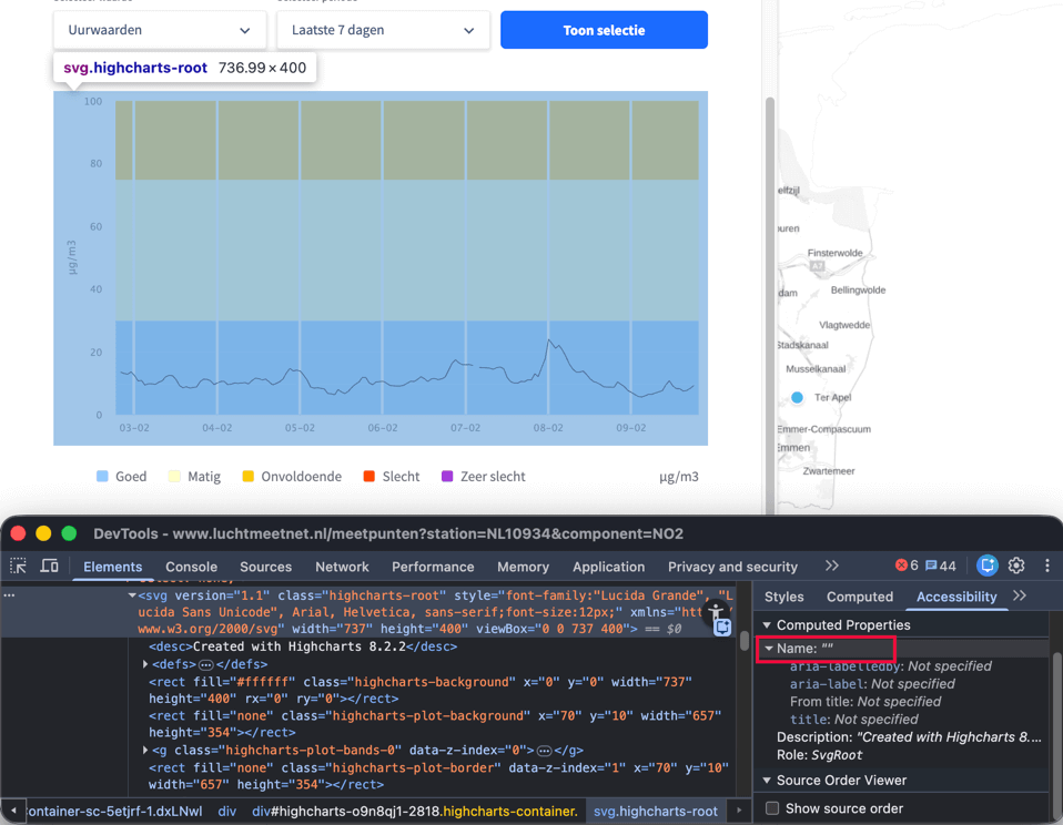 Op deze pagina staat, wanneer deze op een klein scherm wordt bekeken, een onderdeel met verborgen content. De zichtbare tekst is in eerste instantie “Luchtkwaliteit”. Het element waarmee deze verborgen content wordt geopend en gesloten heeft niet de rol van knop.