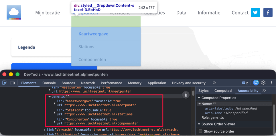 In de header van de website hebben de links “Meetpunten” en “Data” submenu’s. Wanneer een gebruiker van een schermlezer het menu opent, wordt niet doorgegeven of het submenu open of gesloten is.